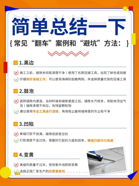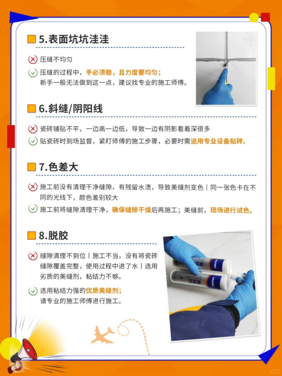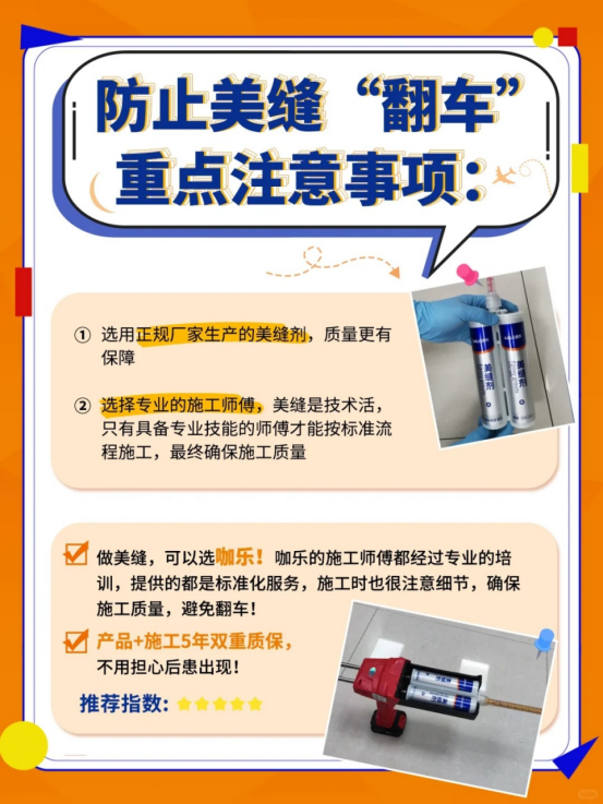 选用粘结力强的优质美缝剂;请专业的施工师傅进行施工